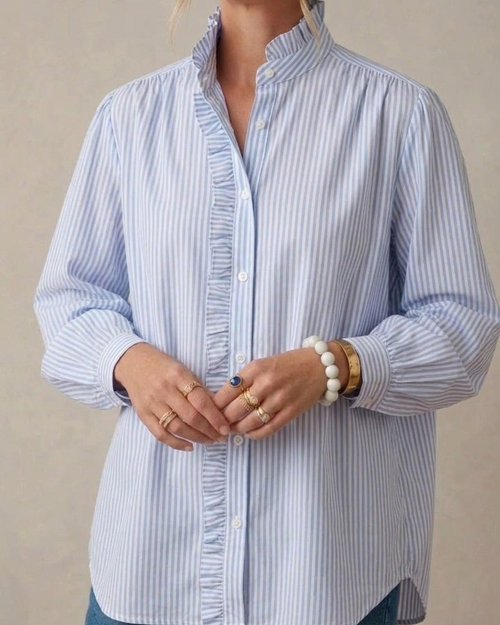 Détails soignés : Poignets boutonnés légèrement bouffants et rayures verticales pour une silhouette allongée.